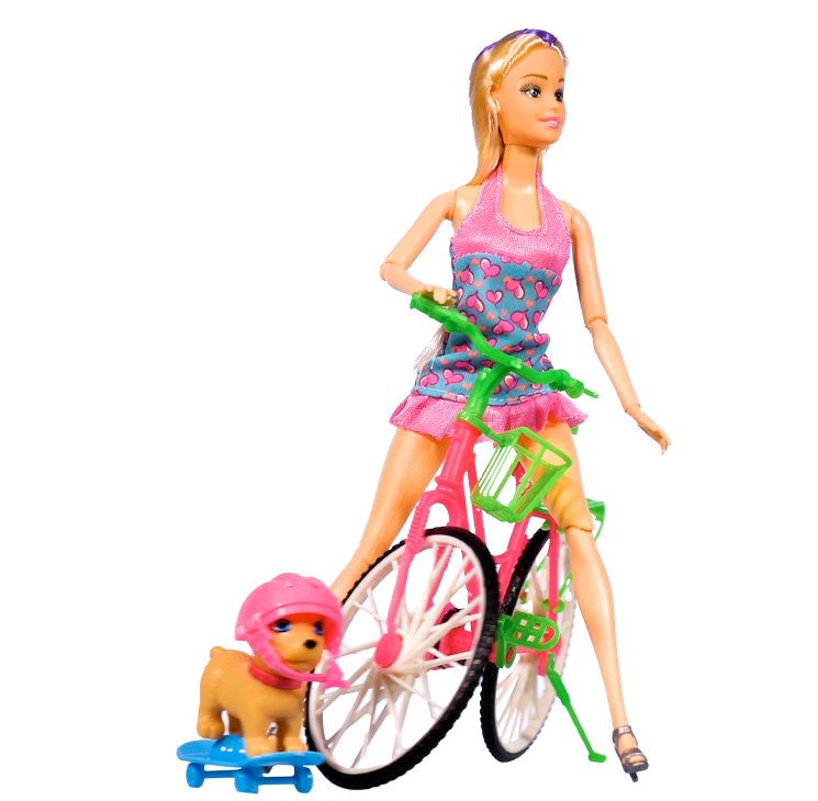 Hermosa Muñeca articulada con su Bicicleta Y mascota en patineta. un juguete que abrirá su imaginación, para vivir muchas aventuras